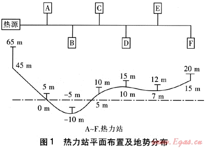 以供熱能力為60×104m2的熱源廠為例,共有6座熱力站,每座熱力站的供熱面積為l0×104m2,一級管網(wǎng)供、回水溫度為130、70℃,設(shè)計(jì)壓力為1.6MPa。熱力站內(nèi)一級側(cè)的承壓能力為1.6MPa,熱力站平面布置及地勢分布見圖1。