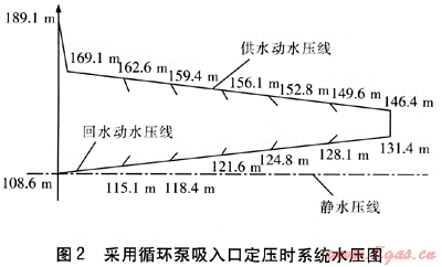 系統(tǒng)水頭損失由熱源、管網(wǎng)、熱力站水頭損失3部分組成。各部分水頭損失為[1~2]:熱源20m;管網(wǎng)水頭損失包括沿程和局部水頭損失,經(jīng)濟(jì)比摩阻取50Pa/m,局部水頭損失按沿程水頭損失的30%計(jì)算;熱力站的水頭損失為15m。經(jīng)計(jì)算,系統(tǒng)水頭損失為80.5m。當(dāng)采用常規(guī)的循環(huán)泵吸入口定壓時(shí),系統(tǒng)水壓圖見圖2。