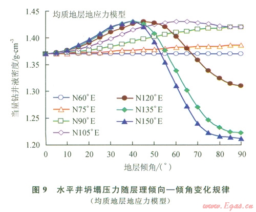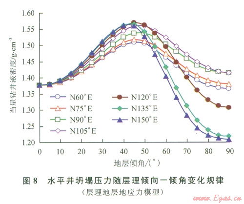 3)在鉆進地層傾角為30°~60°之間的頁巖氣藏水平井時,應(yīng)注意具有較高的坍塌壓力。近水平和近垂直的地層中坍塌壓力有所降低,降低幅度與地層傾向有關(guān),越接近最小地應(yīng)力方向下降幅度越大。
