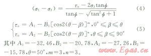 本研究簡化了Jaeger及McLamore[12-13]等人建立的強度準則,根據(jù)實驗數(shù)據(jù)采取了內(nèi)摩擦角恒定,黏聚力(τ)隨角度變化的頁巖地層強度公式:
