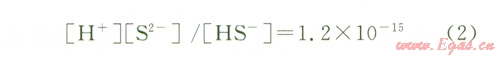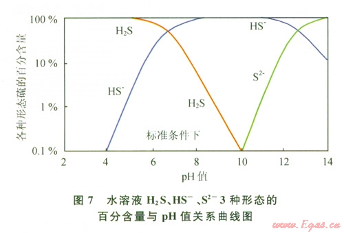 主要存在H2S、HS-、S2-3種形式。根據(jù)上式可以繪出H2S、HS-、S2-3種形態(tài)硫在不同pH值下的摩爾百分含量圖(圖7[8])。