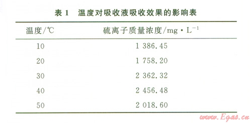 經(jīng)過多次實驗發(fā)現(xiàn)不同室溫條件下所測數(shù)據(jù)有較大差異,在其他實驗條件相同的情況下,隨溫度升高,吸收液中硫離子濃度顯著升高。因此在吸收液吸收裝置下加恒溫磁力攪拌器以此調(diào)節(jié)反應(yīng)溫度,并評價吸收液吸收效果,結(jié)果見表1。
