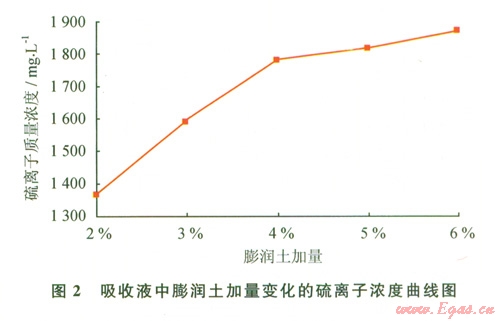 如圖2所示膨潤土加量對吸收液吸收效果有明顯的影響,但在膨潤土加量為4%以后,吸收液中硫離子濃度隨膨潤土加量的增加變化不大。分析產(chǎn)生這種現(xiàn)象的主要原因是膨潤土本身對硫化氫有一定的物理和化學(xué)吸附作用,物理吸附主要是硫化氫分子在膨潤土表面的吸附,化學(xué)吸附主要是發(fā)生在膨潤土膠體表面的陽離子交換吸附。