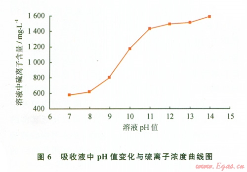 如圖6所示,隨吸收液pH值的增加,反應(yīng)后吸收液中硫離子濃度逐漸增加,當(dāng)吸收液中pH值達ll后吸收液有明顯的吸收效果,這符合鉆井現(xiàn)場在鉆遇含硫化氫地層時調(diào)節(jié)鉆井液pH值大于11的工藝要求。