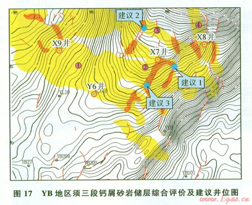 通過(guò)鈣屑砂巖沉積特征分析,確定鈣屑砂巖沉積在水退層序頂部的分流河道中,利用沉積相、地震屬性分析,實(shí)現(xiàn)鈣屑砂巖分布預(yù)測(cè);通過(guò)區(qū)域應(yīng)力場(chǎng),局部應(yīng)力、構(gòu)造變形特征分析、裂縫成因演化分析,確定須三段層有利裂縫為網(wǎng)狀裂縫,具有“雜亂反射”特征,利用多種地震屬性實(shí)現(xiàn)裂縫預(yù)測(cè);通過(guò)儲(chǔ)層上部地層存在的削截現(xiàn)象,實(shí)現(xiàn)了短期沉積暴露面分布預(yù)測(cè)。結(jié)合以上預(yù)測(cè)結(jié)果,實(shí)現(xiàn)YB地區(qū)須三段鈣屑砂巖儲(chǔ)層油氣富集區(qū)綜合預(yù)測(cè)。預(yù)測(cè)結(jié)果顯示油氣富集區(qū)主要集中在鈣屑砂巖發(fā)育帶疊加構(gòu)造裂縫發(fā)育帶,在此基礎(chǔ)上分別在1號(hào)、2號(hào)、3號(hào)砂體提交了3口開(kāi)發(fā)建議井井位(圖17)。