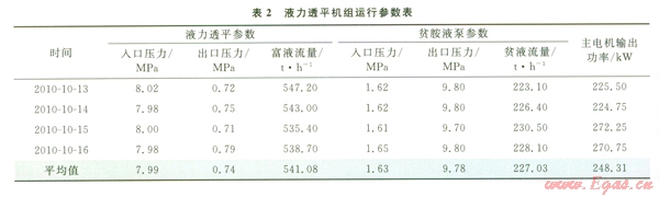 富胺液透平設(shè)計人口壓力為8.371 MPa,出口壓力為l.110 MPa,壓力差為7.261 MPa,設(shè)計流量為596 t/h,回收能量1 006 kW,主電機(jī)輸出功率為104kW。受上游原料氣壓力調(diào)低的影響,原料氣壓力由8.39 MPa下調(diào)至8.00 MPa,液力透平相關(guān)參數(shù)相應(yīng)有所下降。2010年10月13-16日,第3聯(lián)合裝置進(jìn)行100%負(fù)荷性能考核,液力透平運(yùn)轉(zhuǎn)平穩(wěn),相關(guān)性能參數(shù)如表2所示。在原料氣100%負(fù)荷運(yùn)行工況下,透平入口壓力平均值為7.99 MPa,出口壓力平均為0.74 MPa,壓力差平均為7.25 MPa,主電動機(jī)輸出功率平均值為248.31 kW,單臺液力透平回收能量為861.69 kW。通過優(yōu)化液力透平控制技術(shù),各系列裝置在正常運(yùn)行期間均采用液力透平驅(qū)動模式,且裝置工藝運(yùn)行無波動,透平外輸功率平穩(wěn)。
