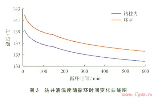 由圖3可知,鉆井液溫度隨循環(huán)時(shí)間的增加逐漸降低。當(dāng)循環(huán)時(shí)間約140 min時(shí),鉆柱內(nèi)和環(huán)空鉆井液溫度出現(xiàn)拐點(diǎn),這是由鉆井液和地層問熱傳遞發(fā)生交換造成的。