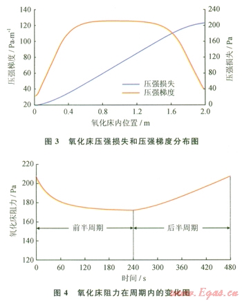 2)在任意周期內(nèi),氧化床阻力在前半周期內(nèi)隨時間增加而不斷降低,進入后半周期后,氧化床阻力開始回升,到后半周期結(jié)束時恢復(fù)到該周期開始時的阻力值;氧化床阻力隨著氣流方向的周期改變以v型波的形式呈現(xiàn)周期性變化。