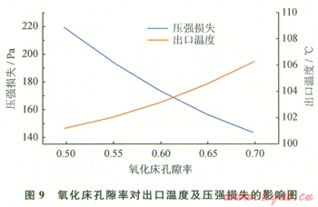 從圖9的氧化床出口溫度變化曲線可以發(fā)現(xiàn),孔隙率的變化對出口溫度影響不大,孔隙率由0.50增大到0.70時,出口溫度僅僅升高了