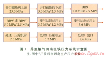南區(qū)塊與蘇里格氣田其他區(qū)塊共用天然氣處理廠,區(qū)塊壓力級制與其他區(qū)塊基本一致(圖1),即井口截?cái)嚅y及上游設(shè)計(jì)壓力為25.0 MPa。井口截?cái)嚅y下游、采氣管線設(shè)計(jì)壓力為6.3 MPa。集氣站設(shè)計(jì)壓力為4.5 MPa,集氣干線、集氣支線設(shè)計(jì)壓力為4.5MPa,注醇管線設(shè)計(jì)壓力為8.0 MPa。