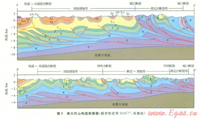 摘 要 位于四川盆地邊緣的大巴山山前帶由于構(gòu)造變形較為強(qiáng)烈,地表地震地質(zhì)情況復(fù)雜,給地震資料采集和處理帶來諸多困難,目前該區(qū)勘探程度還較低。為預(yù)測其油氣勘探前景,從生儲蓋組合、烴源巖條件、儲層條件、蓋層條件等幾個方面分析了該區(qū)油氣成藏條件,發(fā)現(xiàn)其原始成藏條件優(yōu)越,存在3套成藏組合和多種類型的勘探目的層。古油藏解剖結(jié)果表明,山前帶二、三疊系油氣主力烴源巖為上二疊統(tǒng),油氣成藏分為3個階段:①晚三疊世—早侏羅世開始變形,形成寬緩背斜,形成古油藏;②中侏羅世—早白堊世進(jìn)一步變形,圈閉構(gòu)造定型,部分古油藏裂解,形成油氣藏;③古近紀(jì)喜山運(yùn)動對先期構(gòu)造進(jìn)行了強(qiáng)烈的改造,造成古油氣藏的調(diào)整與破壞。綜合評價該區(qū)構(gòu)造變形樣式、儲層分布和油氣顯示特征后認(rèn)為:南大巴山西北部鎮(zhèn)巴斷裂至鐵溪—巫溪隱伏斷裂是油氣勘探有利區(qū),應(yīng)以二疊系長興組和三疊系飛仙關(guān)組礁灘相儲層勘探為主展開工作;東南部雞鳴寺斷裂至鐵溪—巫溪斷裂為二、三疊系出露區(qū),應(yīng)以落實(shí)寒武系膏鹽巖下伏地層的保存條件為主進(jìn)行勘探部署。