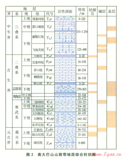 該區(qū)主要經(jīng)歷了2個大的沉積—構(gòu)造演化階段:震旦紀(jì)—中三疊世為海相臺地—臺緣沉積—構(gòu)造演化階段;晚三疊世—始新世為陸相碎屑沉積盆地沉積—構(gòu)造演化階段。總體上缺失上志留統(tǒng)一石炭系,其他層位較為齊全。發(fā)育4套構(gòu)造—地層沉積組合:①基底組合(Pt);②臺地(臺緣)組合(Z—S);③臺地—裂陷邊緣組合(P—T2);④前陸盆地組合(T3x—J)。