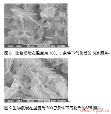 生物質(zhì)炭在蒸汽作用下發(fā)生氣化,其微觀結(jié)構(gòu)也會(huì)發(fā)生變化。使用掃描電子顯微鏡(SEM)對不同溫度下,生物質(zhì)炭經(jīng)過蒸汽氣化后的微觀結(jié)構(gòu)進(jìn)行研究。生物質(zhì)炭在溫度分別為500、600、700和800℃條件下氣化后的SEM照片分別見圖6~9。