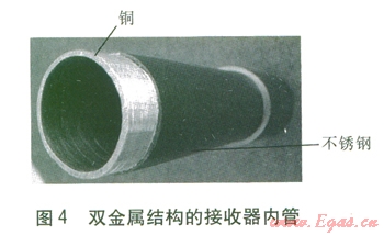 由于接收器的工作壓力高達(dá)l0 MPa,綜合考慮成本、效率、安全等因素,通常采用不銹鋼管作為內(nèi)管,但不銹鋼的熱導(dǎo)率較低,僅為15~18 W/(m·K),而銅可達(dá)450 W/(m·K),這易造成接收器周向熱流量和汽液分布不均,甚至發(fā)生彎曲變形,最終導(dǎo)致玻璃外套管破裂、接收器偏離聚焦線。為了解決這一問題,V.Flores等人[8]提出了一種雙金屬結(jié)構(gòu)的接收器內(nèi)管(見圖4),內(nèi)層采用具有高熱導(dǎo)率的銅以減小管內(nèi)傳熱的周向溫差,外層采用不銹鋼以保證內(nèi)管的工作強(qiáng)度,研究發(fā)現(xiàn)雙金屬結(jié)構(gòu)的內(nèi)管周向溫差較不銹鋼內(nèi)管顯著減小。W.Spirkl等人[9]在聚光集熱器中加入二次反射板,將聚光器匯聚的一部分太陽(yáng)光反射到接收器的另一側(cè)。加入二次反射板后,接收器周向接收的太陽(yáng)能較均勻,但增加了太陽(yáng)光的反射次數(shù),降低了光效率。