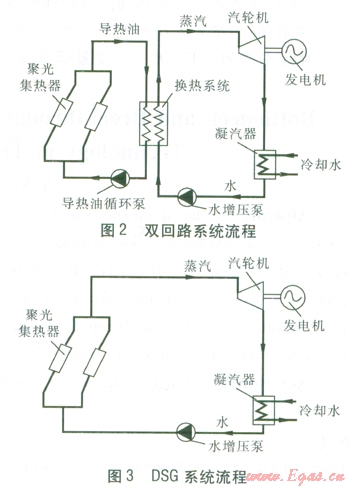 槽式太陽(yáng)能發(fā)電系統(tǒng)分為雙回路系統(tǒng)(見圖2)、DSG(Direct Steam Generation,直接產(chǎn)蒸汽發(fā)電)系統(tǒng)(見圖3)。
