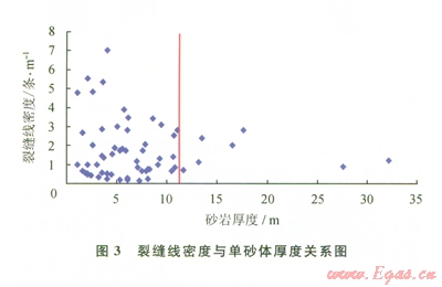 低孔隙度、低滲透率滲砂巖儲層的厚度也是影響裂縫發(fā)育的重要因素。由于厚層砂巖的總體強(qiáng)度比薄層砂巖的總體強(qiáng)度大,抵抗外力破壞的能力強(qiáng)。如果其他條件一致的話,薄層比厚層有更高的裂縫密度,裂縫的線密度也比較大。從本區(qū)裂縫發(fā)育與砂巖厚度關(guān)系可以看出,單砂層厚度在
