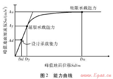 能力——需求譜分析方法的理論基礎(chǔ)為目前在抗震設(shè)計中廣泛采用的靜力彈塑性分析方法,即Push-over分析方法。建構(gòu)筑物在地震中的反應(yīng)由能力曲線代表,該曲線反映了結(jié)構(gòu)受到地震橫向載荷與頂點位移關(guān)系曲線(能力譜)。再將地震波到達(dá)建構(gòu)筑物場地的反應(yīng)譜轉(zhuǎn)化為需求譜,兩曲線的交點即性能點,作為建筑物在地震作用下的峰值位移或加速度。