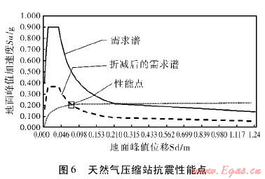 將天然氣壓縮站抗震能力曲線與需求譜繪制在同一坐標(biāo)內(nèi),得到性能點,如圖6所示??梢钥闯觯阅茳c對應(yīng)的地面峰值加速度約為0.2g,地面峰值加速度約為0.07m。該性能點反映了天然氣壓縮站在本次地震中所能承受的極限值。