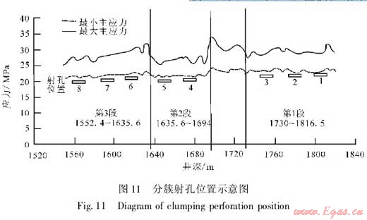 本井優(yōu)化的高滲透帶數(shù)量為8簇,因此,射孔簇?cái)?shù)為8簇。綜合選擇GR(自然伽馬)低、脆性礦物含量高、應(yīng)力值相對(duì)較低的層段進(jìn)行射孔,以有利于裂縫延伸起裂,形成縫網(wǎng)(圖11)。根據(jù)應(yīng)力測(cè)試,QY2井最小主應(yīng)力在22.1~32.4MPa之間,因此,支撐劑應(yīng)滿足35MPa閉合壓力要求。