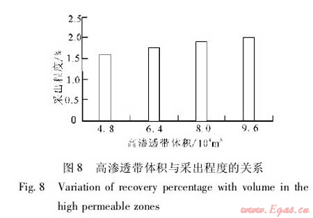 圖7描述了高滲透帶數(shù)量為8簇時(shí),單簇高滲透帶體積與累積產(chǎn)量的關(guān)系。單簇高滲透帶體積為8.0×104m3時(shí),累積產(chǎn)量為4790.8t,采出程度1.9%;高滲透帶體積為9.6×104m3時(shí),累積產(chǎn)量4995.8t,采出程度2.0%(圖8)。可見(jiàn),隨著高滲透帶體積增加,累積產(chǎn)量、采出程度增加,當(dāng)單簇高滲透帶體積大于8.0×104m3時(shí),累積產(chǎn)量、采出程度增加減緩。為最大限度地提高本井采出程度,兼顧斷層影響,最終確定單簇高滲透帶體積為9.6×104m3。
