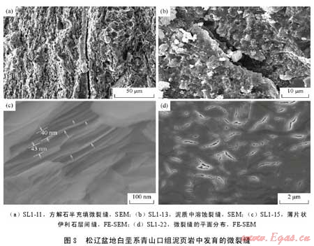 摘 要:為了查明泥頁巖系統(tǒng)微觀孔隙發(fā)育特征及其油氣地質(zhì)意義,利用掃描電鏡及場發(fā)射掃描電鏡二次電子成像技術對松遼盆地白堊系青山口組一段泥頁巖中的微觀孔隙進行了系統(tǒng)觀察。該套泥頁巖中主要發(fā)育了5種類型孔隙,即基質(zhì)晶間孔、有機質(zhì)孔、溶蝕孔、粒間孔、晶內(nèi)孔;此外,還發(fā)育大量微米—亞微米級(納米級)微裂縫,包括溶蝕縫、充填縫及層間縫3類。微孔隙和微裂縫構成復雜微裂縫網(wǎng)絡-孔隙系統(tǒng),為烴源巖生成的油氣向外排驅(qū)提供了有效通道,同時也為殘留在頁巖中的油氣提供了充分的儲集空間,對于油氣的初次運移以及頁巖油氣等非常規(guī)資源的儲集具有重要意義。