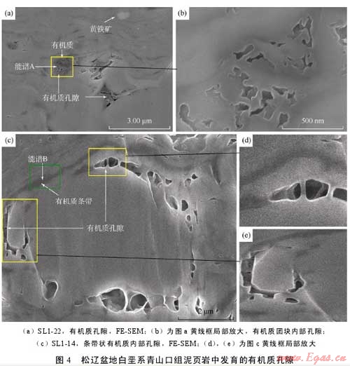 有機質(zhì)孔隙主要指有機質(zhì)團塊內(nèi)部或有機質(zhì)生烴后內(nèi)部殘留的孔隙。圖4為場發(fā)射掃描電鏡二次電子成像后觀察到的泥頁巖樣品中的有機質(zhì)孔隙,圖4a為有機質(zhì)團塊中的孔隙(圖4a中黃線標出的黑灰色區(qū)域A區(qū)對應的元素能譜見圖9a),孔徑為10~1500nmz已經(jīng)向烴類轉(zhuǎn)化,伴隨這一地質(zhì)過程,泥頁巖中產(chǎn)生大量有機質(zhì)生烴后的殘留孔隙,若泥頁巖處于高—過成熟階段,有機質(zhì)生烴后的殘留孔隙數(shù)量會大幅增加,其孔徑也會變大。
