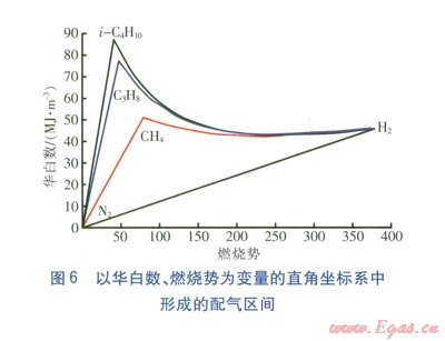 基于互換性原理進(jìn)行的試驗(yàn)氣配制,一般將甲烷、H2、N2三組分、丙(丁)烷、H2、N2三組分作為原料氣,控制試驗(yàn)氣的華白數(shù)、燃燒勢、黃焰指數(shù)等關(guān)鍵燃燒特性指數(shù)與基準(zhǔn)氣相等,并進(jìn)行以華白數(shù)、燃燒勢為主要控制指標(biāo)的配制設(shè)計(jì)[7],建立配制試驗(yàn)氣的整體分布區(qū)間。以CH4、H2、N2三組分,C3H8、H2、N2三組分,n-C4H10、H2、N2三組分,i-C4H10、H2、N2三組分為原料氣,在以華白數(shù)、燃燒勢為變量的直角坐標(biāo)系中形成的配氣區(qū)間見圖6。由圖6可知,各組原料氣形成的配氣區(qū)間邊界線并不全為直線,任兩種可燃?xì)怏w形成的配氣邊界線為指數(shù)曲線,而N2與H2、N2與另一種烷烴可燃?xì)怏w形成的配氣邊界線為直線。