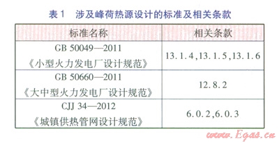 目前,涉及峰荷熱源設(shè)計(jì)的標(biāo)準(zhǔn)及相關(guān)條款見表1。針對小型火力發(fā)電廠,GB 50049-2011第