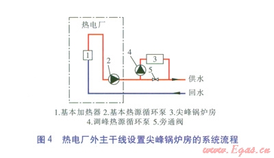 熱電廠外主干線設(shè)置尖峰鍋爐房(系統(tǒng)流程見圖4)。由圖4可知,熱水經(jīng)過熱電廠內(nèi)基本加熱器加熱后進(jìn)入熱網(wǎng)主干線。當(dāng)供暖期處于初末寒期時(shí),旁通閥開啟,尖峰鍋爐房不投入運(yùn)行。當(dāng)進(jìn)入嚴(yán)寒期時(shí),旁通閥關(guān)閉,熱電廠出水經(jīng)尖峰鍋爐房加熱至設(shè)計(jì)溫度。對于這種設(shè)置方式,峰荷熱源的投資、運(yùn)營方均為供熱公司。