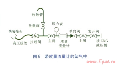 對于在卸氣柱上增加質(zhì)量流量計(jì)的工藝。是從CNG加氣機(jī)的工藝流程借鑒過來的,還應(yīng)該在流量計(jì)之前增加壓力表,為卸氣柱增加一個(gè)箱體,另外,拉斷閥、單向閥(此處的單向閥還有防止管道氣逆流時(shí),保護(hù)質(zhì)量流量計(jì)的作用)必須加裝。帶質(zhì)量流量計(jì)的卸氣柱見圖6。
