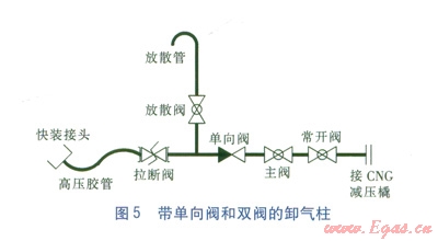 ①用CNG減壓橇來臨時(shí)供氣,或是不連續(xù)供氣(由于維修等原因可以臨時(shí)停止供氣的情況)時(shí),帶單向閥的卸氣柱工藝是較為合理的,不僅簡單,也達(dá)到了較高的安全性。