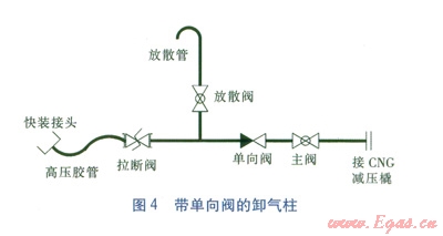 在卸氣柱卸氣過程中,由于工作人員的疏忽,在更換第二輛CNG氣瓶車時(shí),誤操作將第一輛和第二輛CNG氣瓶車所連接的卸氣柱主閥同時(shí)打開。這時(shí)就會造成第二輛車內(nèi)的CNG反充入第一輛車(尤其是CNG減壓橇流量不大的時(shí)候),使得第一輛車內(nèi)的余氣量增加,影響正常運(yùn)營。為了防止工作人員誤操作所帶來的問題,可以在卸氣柱主閥的前面增加一個(gè)單向閥。帶單向閥的卸氣柱見圖4。