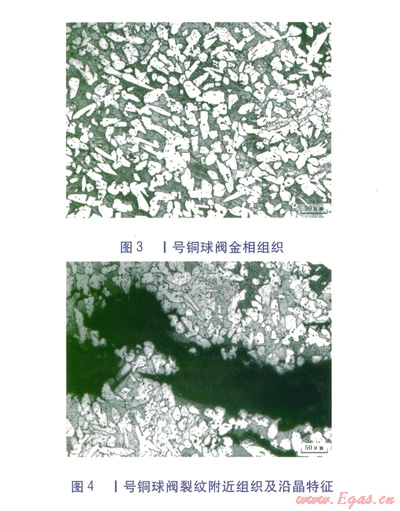 對I號、Ⅱ號銅球閥的金相組織[1]及裂紋進行分析,結果如下:
