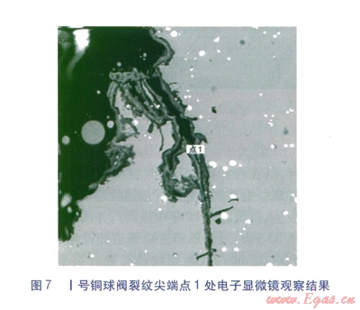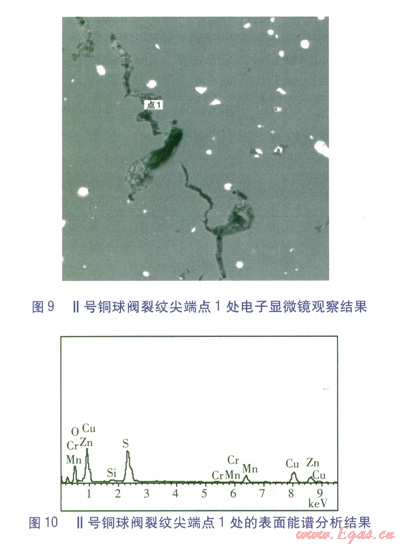 對Ⅱ號銅球閥裂口尖端處的灰色物質試樣進行掃描電子顯微鏡觀察,結果表明:裂紋表面可見明顯灰色覆蓋物。能譜分析結果表明主要成分為Cu、Zn、S、O和少量Cr、Mn等,Ⅱ號銅球閥裂紋尖端點l處的電子顯微鏡觀察結果和表面能譜分析結果見圖9、10。
