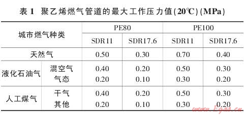 1.2.2 在聚乙烯燃?xì)夤艿赖膲毫υO(shè)計(jì)中,還需要考慮到燃?xì)庵兴姆枷銦N類(lèi)物質(zhì)所產(chǎn)生的影響,以及管道的施工條件等因素,根據(jù)國(guó)家相關(guān)的行業(yè)標(biāo)準(zhǔn),聚乙烯燃?xì)夤艿涝试S的最大工作壓力如表1。