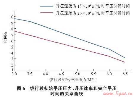 按照15萬m3/h和20萬m3/h的升壓速率,從繞行段整體升壓至3MPa開始,計(jì)算完全平壓所需要的時(shí)間,得出繞行段初始?jí)毫Α⑸龎核俾屎蜁r(shí)間之間的關(guān)系曲線(圖6)。繞行段升壓至4.5MPa后,按照20萬m3/h的升壓速率,完全平壓需要5.5h;在繞行段升壓至5.2MPa后,按照15萬m3/h的升壓速率,完全平壓需要6h。為確保升壓盡快完成,同時(shí)考慮安全因素和計(jì)算誤差,選擇在繞行段升壓至4.5MPa作為進(jìn)氣平壓點(diǎn)。