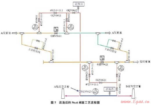 對(duì)No.6閥室進(jìn)行工藝改造,增加二級(jí)節(jié)流,通過兩級(jí)降壓解決節(jié)流降溫和振動(dòng)問題。利用DN300管道將兩閥室的放空口進(jìn)行連接(圖7藍(lán)色線條部分),并加裝2個(gè)注氮閥,加裝1臺(tái)節(jié)流截止放空閥GLV0623和1個(gè)壓力表。為解決節(jié)流造成的振動(dòng)對(duì)放空管道的影響,在GLV0612和GLV0622節(jié)流截止放空閥之間的放空管道加裝壓重塊,然后回填并夯實(shí)。