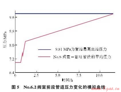 根據(jù)No.6.2閥室前段管道平均壓力8MPa和中烏管道首站進(jìn)口流量600萬m3/h的工況進(jìn)行模擬計(jì)算,在首站壓縮機(jī)組不停機(jī)的情況下,No.6.2閥室關(guān)閉約6h后,該閥室上游管道平均壓力達(dá)到9MPa;約11h后,該閥室上游管道平均壓力達(dá)到9.8MP(a圖5)經(jīng)過計(jì)算得出,約9h后,首站壓縮機(jī)組因出口壓力達(dá)到9.8MPa而停機(jī),進(jìn)而使阿姆河氣田外輸站壓縮機(jī)組停機(jī),影響上游的正常運(yùn)行。為了安全起見,可以按No.6.2閥室上游管道平均壓力達(dá)到9MPa時(shí)的6h作為平壓作業(yè)的實(shí)施時(shí)間。