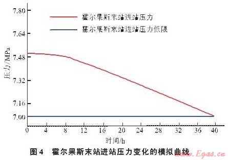 根據(jù)中亞天然氣管道霍爾果斯末站的進(jìn)站壓力7.5MPa和出口流量700萬m3/h的工況進(jìn)行模擬計(jì)算,No.8.2閥室關(guān)閉36h后,霍爾果斯末站進(jìn)站壓力降到7.1MPa(圖4),即No.8.2閥室關(guān)閉36h后將影響到下游正常運(yùn)行。