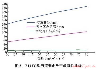 No.6閥室的旁通和放空截止閥均采用FJ41Y-600節(jié)流截止放空閥,根據(jù)廠家提供的該閥滿足流量、壓差的開度范圍,模擬壓差為8~0.2MPa的節(jié)流特性曲線(圖3)。在(30~80)萬m3/h的流量條件下,FJ41Y型節(jié)流截止閥的流道直徑、開啟高度行程、手輪開啟的轉(zhuǎn)數(shù)與通過流量呈線性關(guān)系。當(dāng)手輪開啟5.8轉(zhuǎn)時(shí),通過流量將達(dá)到30萬m3/h,遠(yuǎn)遠(yuǎn)超出置換投產(chǎn)期間的控制流量;當(dāng)手輪每開啟0.5轉(zhuǎn)時(shí),通過流量將增加5萬m3/h。