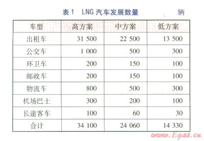 根據(jù)各類LNG車輛潛在用戶的特點(diǎn),對(duì)各類LNG汽車發(fā)展數(shù)量及年用氣量進(jìn)行了高、中、低3種方案的預(yù)測(cè),分別見表1、2。