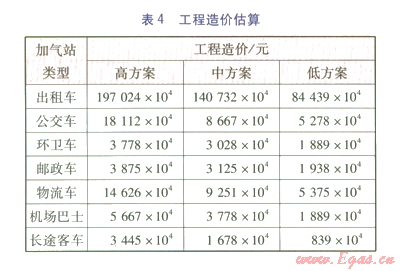 根據(jù)LNG車輛用戶的特點(diǎn)及北京市的實(shí)際情況確定加氣站的建設(shè),郵政車、物流車以及50%出租車的加氣站采用與規(guī)劃的加油站建合建站,分別進(jìn)行管理;公交車、環(huán)衛(wèi)車、機(jī)場(chǎng)巴士、長(zhǎng)途客車以及50%出租車的加氣站考慮改造有條件的已建加油站進(jìn)行聯(lián)合建站。各方案的工程造價(jià)估算見表4。