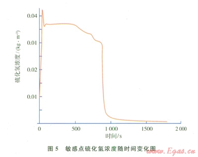 對(duì)于含硫天然氣擴(kuò)散引起的風(fēng)險(xiǎn),需要計(jì)算特定位置硫化氫含量的變化情況,即各網(wǎng)格點(diǎn)或敏感目標(biāo)處硫化氫含量隨時(shí)間變化情況。分別以某井場(chǎng)井噴和某天然氣凈化裝置事故為例,得到事故發(fā)生時(shí)硫化氫的時(shí)空分布情況(圖2~5)。