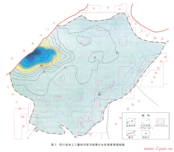 須家河組暗色泥質(zhì)烴源巖主要發(fā)育于須一段、須三段、須五段,生烴中心在川西坳陷中段(圖2),其生烴強度最大,為100×108~300×lO