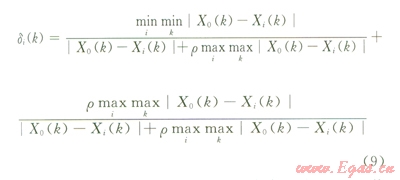 為所有比較序列各個指標絕對差的最大值;| X0 (k)- Xi(k)|為第i個序列第k個指標與參考序列絕對差值。