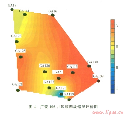 應用儲層評價方法對廣安2井區(qū)須六段儲層和廣安106井區(qū)須四段儲層進行了分類評價(圖3、4)。從圖中可以看出,廣安2井區(qū)須六段儲層中部南北向儲層為Ⅰ、Ⅱ類儲層;向東、西兩翼發(fā)展儲層逐漸變差,為Ⅲ、Ⅳ類儲層。因而,中部南北向為氣藏富集區(qū),是氣藏開發(fā)的重點區(qū)域。廣安106井區(qū)須四段儲層整體為Ⅲ、Ⅳ類儲層,西北翼和南部儲層相對較好。