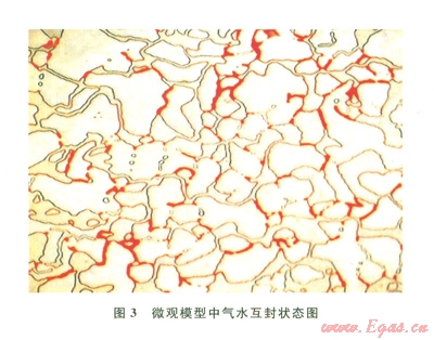 微觀模型含水狀態(tài)下開發(fā)物理模擬實驗表明,對于低滲透砂巖氣藏來講,由于水相一般為潤濕相,主要分布在微細(xì)孔喉內(nèi)及巖石表面,氣體賦存在孔隙內(nèi),含水微細(xì)孔喉包圍控制孔隙體,形成氣水互封的狀態(tài)(圖3)。開發(fā)過程中,氣相產(chǎn)出要突破孔喉處水相的束縛作用。