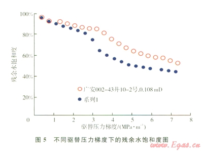 對須家河組2塊低滲透巖樣進(jìn)行了不同壓力梯度下氣驅(qū)飽和水巖樣實驗,在初始高含水飽和度階段,隨著驅(qū)替壓力梯度的增大,殘余水飽和度降低緩慢,主要是由于氣相飽和度小于20%,不能產(chǎn)生連續(xù)氣相運移。隨著驅(qū)替壓力梯度的進(jìn)一步增大,氣相飽和度逐步增加,達(dá)到臨界含氣飽和度20%后,形成連續(xù)運移,這時氣相運移進(jìn)入大喉道及其控制的孔隙中,使得含水飽和度快速降低。當(dāng)含水飽和度降低到50%后,氣相進(jìn)入更細(xì)小的喉道及孔隙的難度加大,驅(qū)替壓力梯度的增加導(dǎo)致含水飽和度緩慢降低(圖5)。須家河組低滲透砂巖氣藏儲層含水飽和度在40%~60%之間,高于束縛水飽和度,存在0~20%的可動水飽和度。驅(qū)替壓力梯度越大,水相越容易動用。