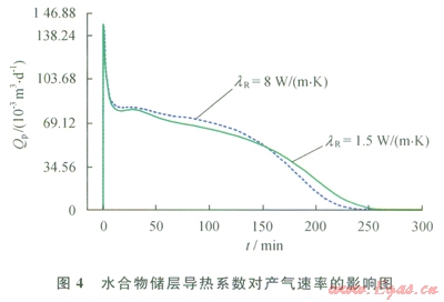 導(dǎo)熱系數(shù)是指水合物儲(chǔ)層傳播熱量的能力。水合物分解是一個(gè)吸熱過(guò)程,對(duì)于水合物地層,若其導(dǎo)熱系數(shù)大,則在單位時(shí)間多孔介質(zhì)中有更多的熱量傳遞到水合物分解前緣,對(duì)水合物分解有更好的促進(jìn)作用。圖4顯示了地層導(dǎo)熱系數(shù)(lR)分別為1.5 W/(m·K)和8W/(m·K)條件下水合物藏產(chǎn)氣速率隨時(shí)間變化的關(guān)系[28]??梢园l(fā)現(xiàn),在其他參數(shù)相同的條件下,在開(kāi)采的前期,隨著地層導(dǎo)熱系數(shù)的增加,水合物產(chǎn)氣速率增加;開(kāi)采后期隨著地層導(dǎo)熱系數(shù)的增加,水合物產(chǎn)氣速率反而減小,但導(dǎo)熱系數(shù)對(duì)水合物藏產(chǎn)氣速率的總體影響很小。