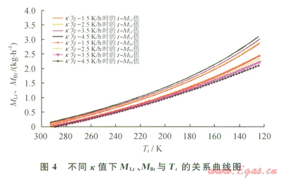 由于冷卻速度不同會(huì)導(dǎo)致瞬時(shí)進(jìn)入儲(chǔ)罐的LNG流量和冷卻所需的LNG需求量不同,同時(shí)導(dǎo)致瞬時(shí)排出儲(chǔ)罐的BOG流量和冷卻過程總共排出的BOG量也不同。當(dāng)儲(chǔ)罐壓力為111kPa,環(huán)境溫度為293K,儲(chǔ)罐冷卻初始溫度為293K,冷卻速度分別為-1.5K/h、-2.5 K/h、-3.5K/h、-4.5K/h時(shí),冷卻過程中冷卻時(shí)間(t)與LNG流量(MLt)、排放BOG流量(MBt)間的關(guān)系如圖3所示,冷卻過程中儲(chǔ)罐溫度(Tt)與LNG流量(MLt)、排放BOG流量(MBt)間的關(guān)系如圖4所示。